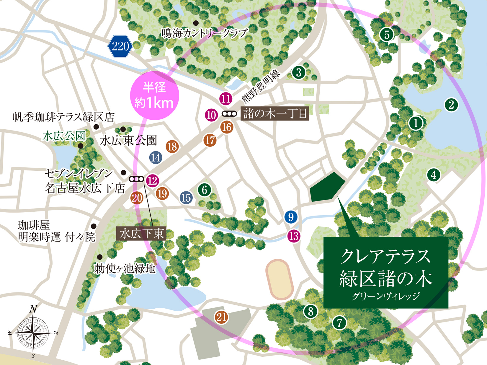 中部支社 住宅事業部※掲載の航空写真は、2023年9月に撮影したものに画像処理を施しております。※掲載の街並み写真は2025年3月に撮影したものです。※徒歩分数は地図上の概則距離80m=1分として換算したものです。 自転車分数は地図上の概則距離240m=1分として換算したものです。 ※⾞の所要時間は⽇中平常時に実測したものです。信号や渋滞、交通量の状況によって異なります。※電車の表示分数は、日中平常時の所要時間で時間帯によって異なります。※環境および施設写真は、2023年9月に撮影したものです。※地図は、概略図のため省略している道路・施設等があります。また、建物の位置・距離・縮尺等は実際とは異なります。※交通図・⾼速道路概念図は、概略図で省略されている駅・バス停・路線・インターチェンジ・ジャンクション・道路等があります。※掲載の電車所要時間は通勤時[()内は日中平常時]のもので、乗り換え時間を含みます。通勤時は平日7:30~9:30、日中平常時は平日10:00~16:30の所要時間を表記しており、時間帯により異なります。※Yahoo!路線情報より※掲載のバスの所要時間は通勤時のもので、市営バス・名鉄バスともに平日6:30~9:30「諸ノ木」停発の所要時間を表記しており、時間帯により異なります。※所要時間は「駅すぱあと」より。※時刻表は2023年10月現在の名古屋市交通局時刻表より。