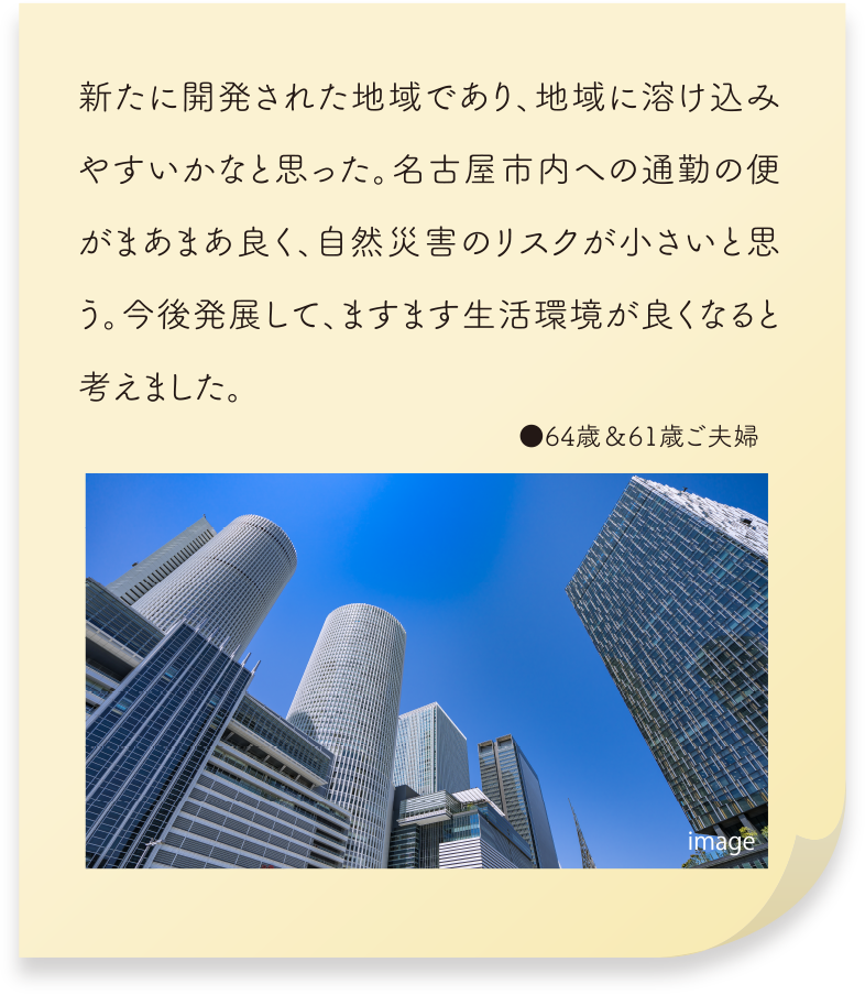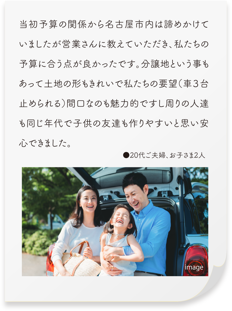 中部支社 住宅事業部※掲載の航空写真は、2023年9月に撮影したものに画像処理を施しております。※掲載の街並み写真は2025年3月に撮影したものです。※徒歩分数は地図上の概則距離80m=1分として換算したものです。 自転車分数は地図上の概則距離240m=1分として換算したものです。 ※⾞の所要時間は⽇中平常時に実測したものです。信号や渋滞、交通量の状況によって異なります。※電車の表示分数は、日中平常時の所要時間で時間帯によって異なります。※環境および施設写真は、2023年9月に撮影したものです。※地図は、概略図のため省略している道路・施設等があります。また、建物の位置・距離・縮尺等は実際とは異なります。※交通図・⾼速道路概念図は、概略図で省略されている駅・バス停・路線・インターチェンジ・ジャンクション・道路等があります。※掲載の電車所要時間は通勤時[()内は日中平常時]のもので、乗り換え時間を含みます。通勤時は平日7:30~9:30、日中平常時は平日10:00~16:30の所要時間を表記しており、時間帯により異なります。※Yahoo!路線情報より※掲載のバスの所要時間は通勤時のもので、市営バス・名鉄バスともに平日6:30~9:30「諸ノ木」停発の所要時間を表記しており、時間帯により異なります。※所要時間は「駅すぱあと」より。※時刻表は2023年10月現在の名古屋市交通局時刻表より。